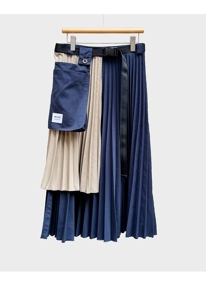 Skirt Taki es una prenda con trabajo textil de plisado artesanalmente, dando peso y movimiento a la pieza, de largo irregular, con una pretina ajustable desde la talla S a la XL, incorpora un cinturón de clip al exterior de la pretina para ajustar y ojal y botón en él, además un bolsillos desmontables.