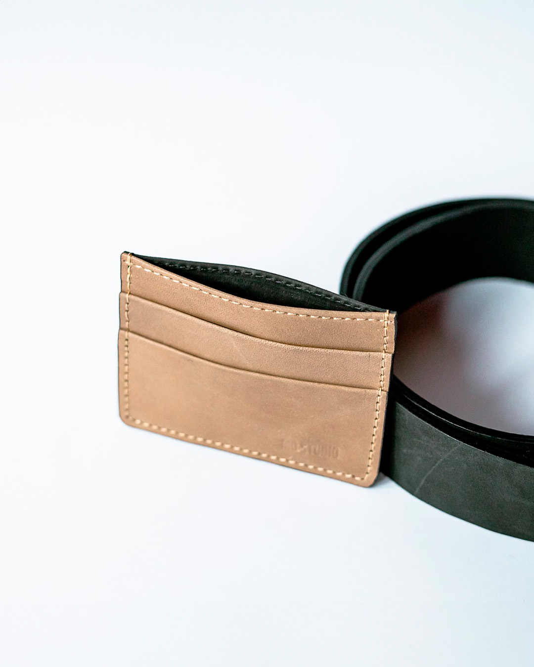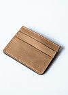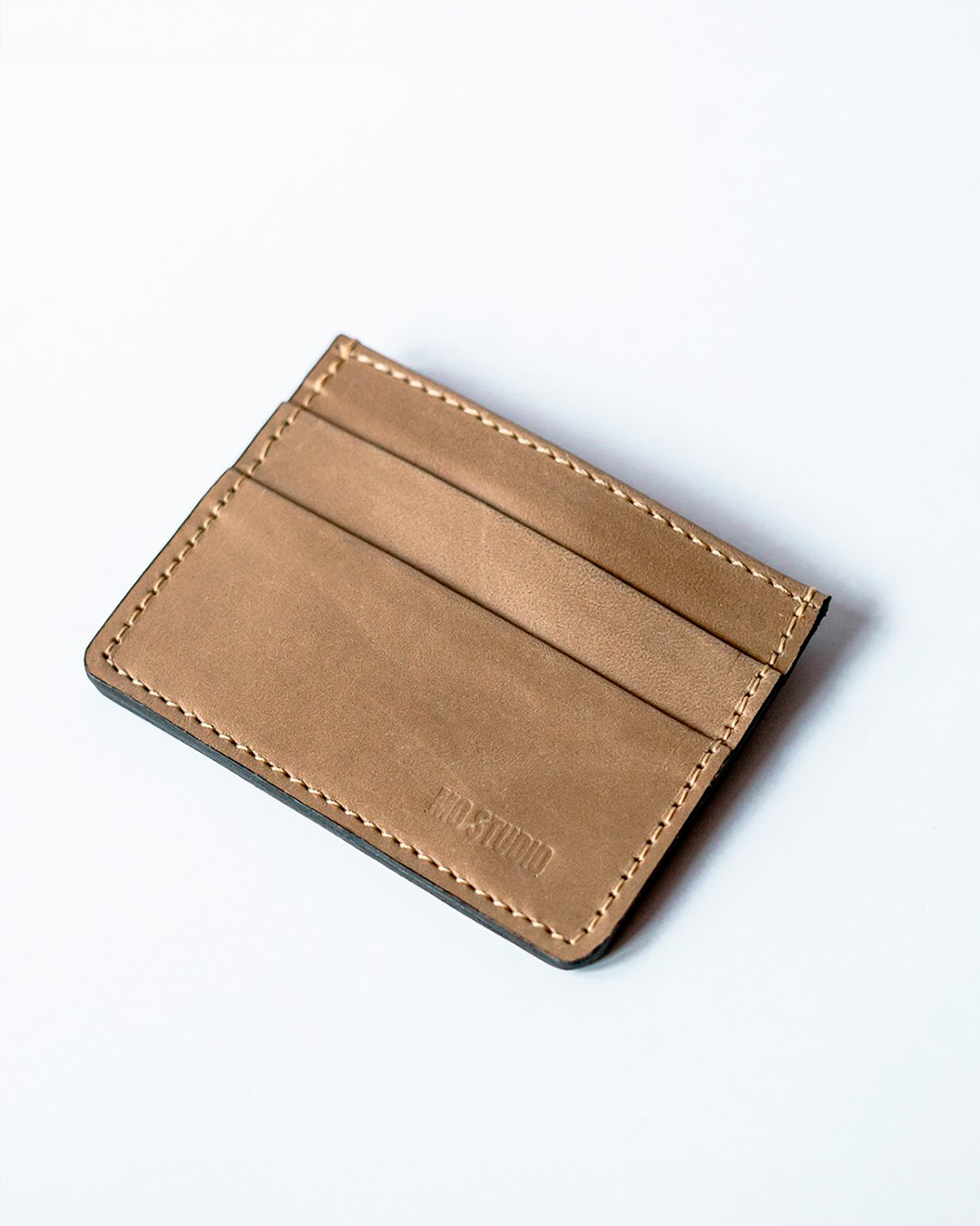 Tarjetero de cuero 100%. Borde redondeado con costuras al tono. Doblado de bolsillos sin costura. Logo con cuño.