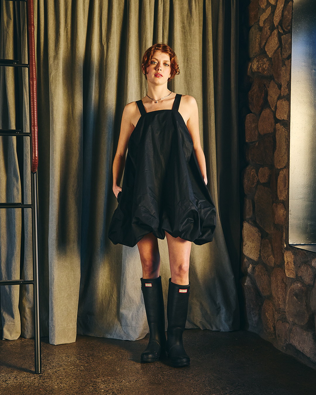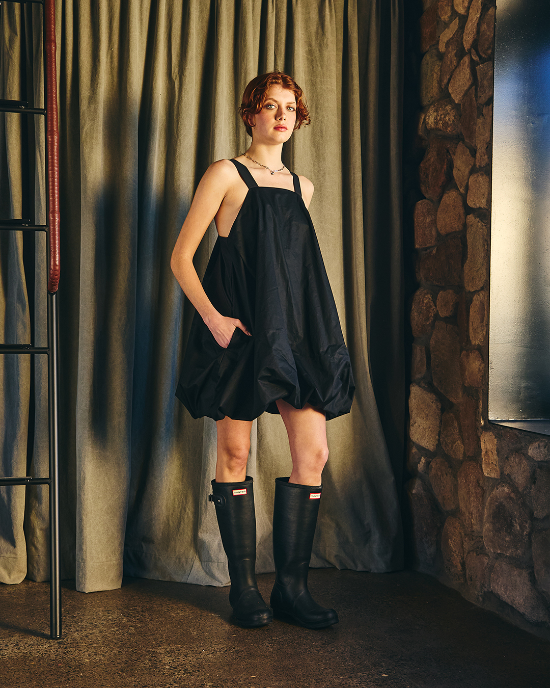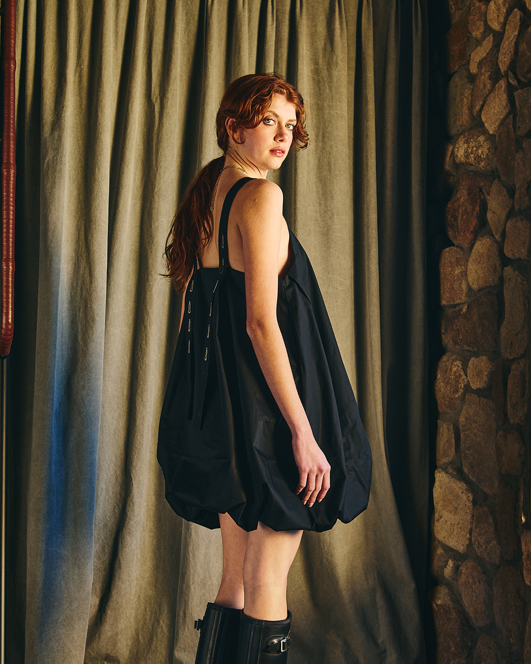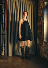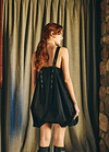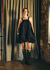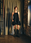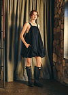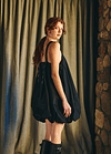 Vestido corto con escote recto en el delantero y profundo en la parte trasera y laterales escotados. Se ajusta con dos tirantes que nacen desde el delantero y se regula el largo según donde se abotone en la espalda, el diseño se frunce en el dobladillo lo que le da la característica forma de globo, pudiendo ajustar el largo del vestido según se quiera con el falso que cuenta con elasticidad.