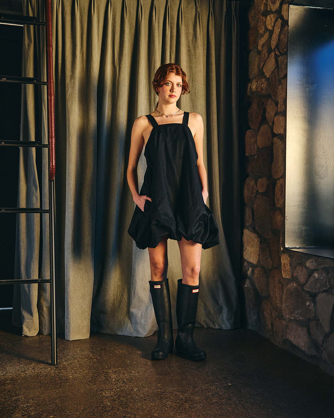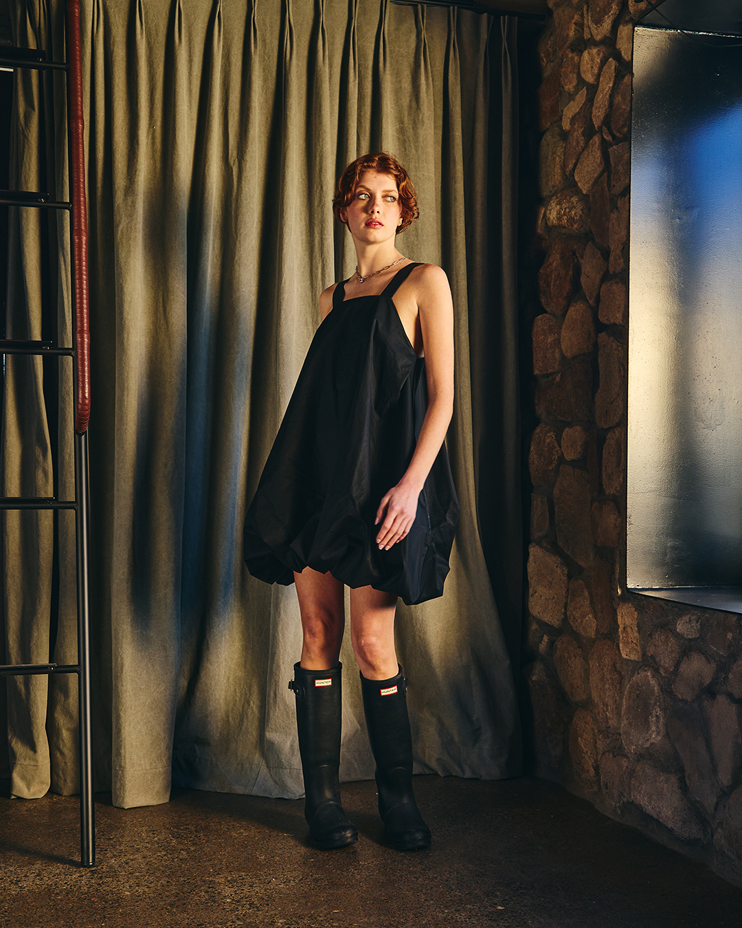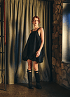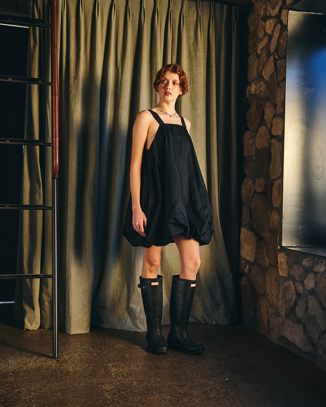 Vestido corto con escote recto en el delantero y profundo en la parte trasera y laterales escotados. Se ajusta con dos tirantes que nacen desde el delantero y se regula el largo según donde se abotone en la espalda, el diseño se frunce en el dobladillo lo que le da la característica forma de globo, pudiendo ajustar el largo del vestido según se quiera con el falso que cuenta con elasticidad.